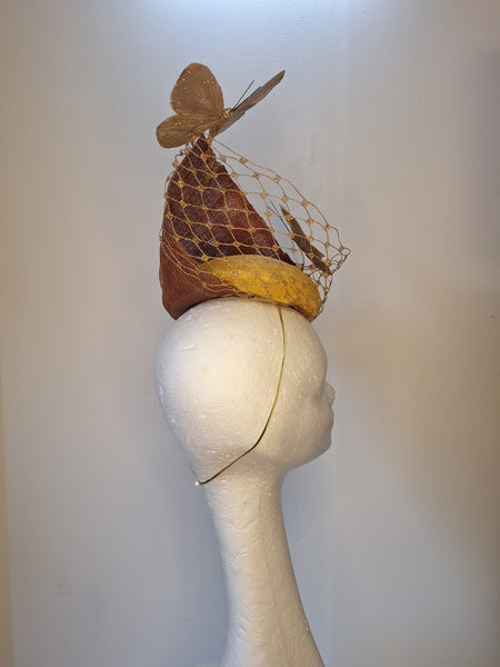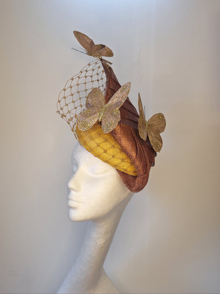 Sinamay teardrop base, signature pleat design, golden veil mesh and suspended feathered butterflies
