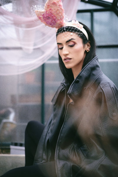 Cherry Blossom Love Heart, back with ivory silk, ivory pompom veil adorned with rhinestones