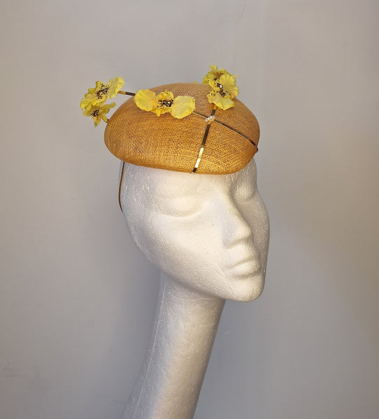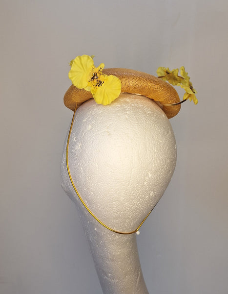 Orchids floating this glowing amber sinamay teardrop beret, with gold elastic.