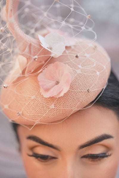 Signature pleat adorned by DecoFlowers' handcrafted hydrangea and delicate rhinestones, perfect for modern weddings, race days and formal Spring/Summer occasions.